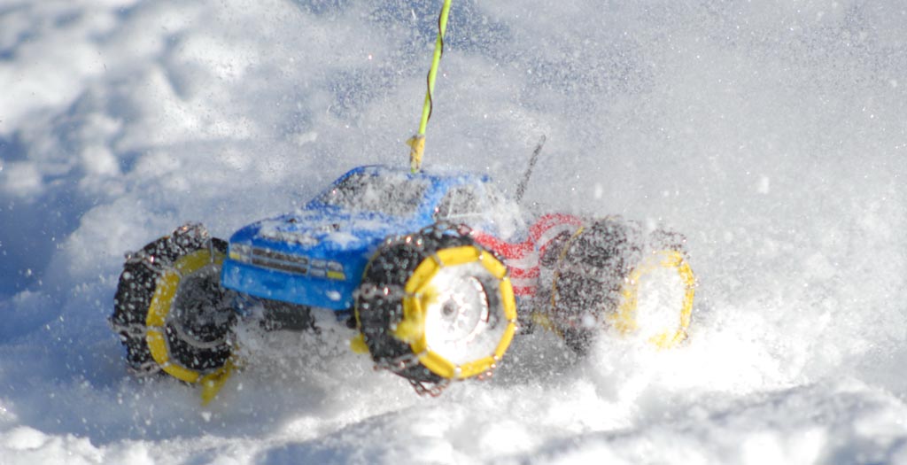 Fangen wir mal mit den unangenehmen Seiten an: Fahren im Schnee ist auch für ein Modellauto nicht so harmlos wie es zunächst scheint. Die Wahrscheinlichkeit ist ziemlich groß, dass das Auto dabei Schaden nimmt, und es können hässliche Unfälle passieren, an die man nicht so schnell denkt. Daher: Wenn Sie es selbst probieren möchten, dann nehmen Sie unsere Tipps als wohlgenmeinte Ratschläge, die wir selbst probiert haben - der Rest geht auf Ihr Risiko.