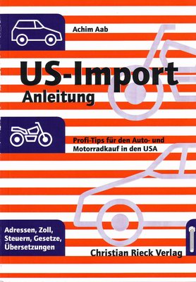 Während der Auto-EU-Import inzwischen bereits recht weit verbreitet ist, gibt es eine noch fast unbekannte Möglichkeit für eine weit größere Ersparnis: den Selbstimport von Autos aus den USA. Noch denken viele, diese Methode sei zu aufwendig, aber die ersten machen bereits das ganz große Geschäft. Gleichgültig, ob Sie nur einmal oder immer wieder Fahrzeuge aus den USA importieren wollen - dieses Buch liefert das gesamte Know-how, z.B.: aktuelle Gesetze, Übersetzungen mit Musterbriefen, Zoll, Transport, TÜV- und Umbau-Tipps, Versicherung und vieles mehr. 248 Seiten, 6. Auflage 2008 (vollkommen überarbeitet und erweitert), ISBN 3-924043-52-3, EUR 30,- [bestellen] |